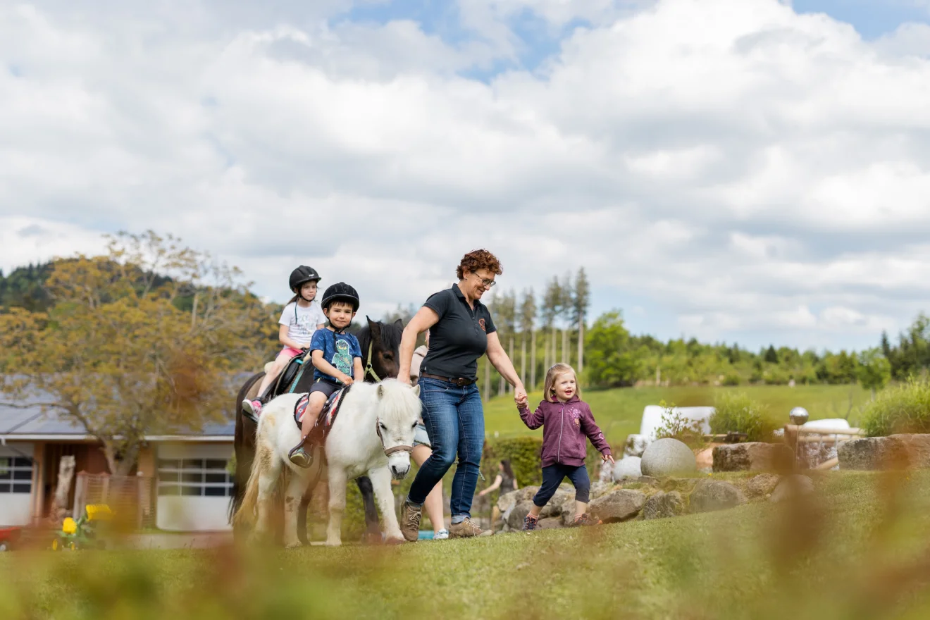 Der Hof selbst ist ein kleines Paradies für Kinder: Ob Kühe füttern, mit den Ziegen auf Tuchfühlung gehen, Traktor fahren, Eier einsammeln, Pony reiten oder auf dem Spielplatz toben – hier gibt es viel zu entdecken und zu erleben. Während die Kleinen das Hofleben erkunden, finden die Großen Ruhe und Erholung zwischen Wiesen, Wäldern und Bergpanorama.
